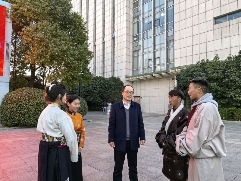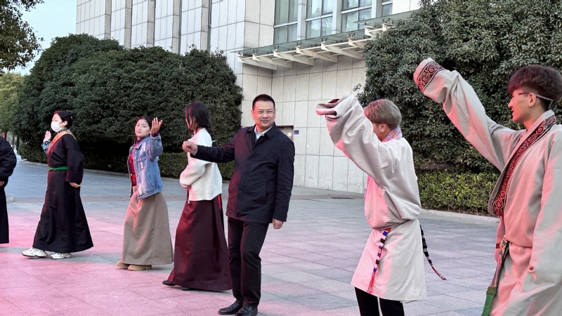 随后,我院民族学生献上一段壮丽的锅庄舞,在过程中,他们邀请老师们一起上台共舞,有的老师可能不太熟悉,民族同学们则热情地带跳,大家按顺时针,手牵着手划着圆圈,体会着浓郁的民族文化氛围,用实际行动阐述了各族师生像“石榴籽“一样抱在一起的真正含义。