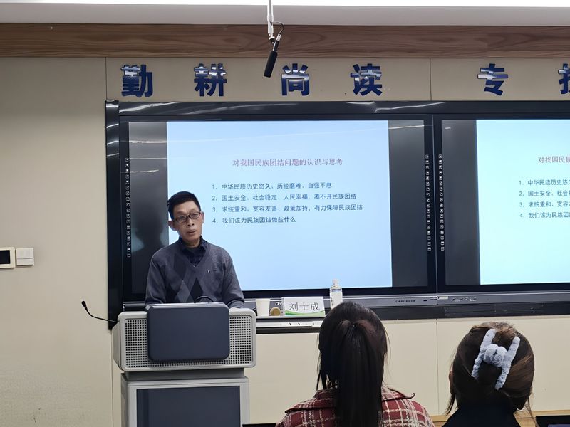 讲座中,刘士成老师对我国民族团结问题的认识与思考作出精彩讲授,从“我国团结之源——国土安全、社会稳定、人民幸福离不开民族的团结——以及求统重和、宽容友善、政策加持的长远之治对民族团结的保障——和我们应该民族团结做些什么?”四个角度深刻剖析,突出阐释了习近平总书记提出的“铸牢中华民族共同体意识”的重要内涵,强调要切实尊重、保护和传承各民族的优秀文化,要在尊重差异、包容多样中实现各民族文化交融共生、和谐发展,各族师生要像“石榴籽“一样紧紧抱在一起,努力提高自己的道德与文化素养。
