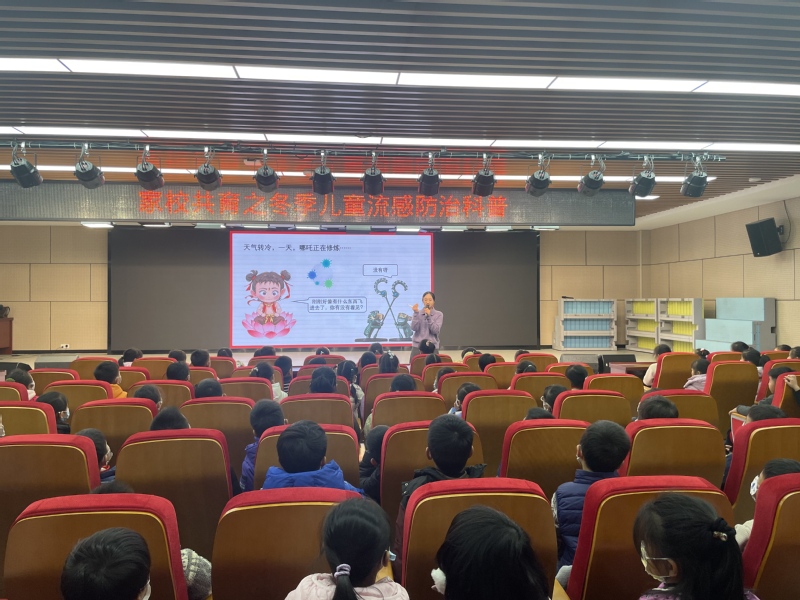 2025年12月9日,江苏食品药品职业技术学院制药工程学院的教师团队走进天津路小学,为百余名学生带来了一场别开生面的秋冬季健康科普讲座。本次讲座以“哪吒大战流感”为主题,通过生动形象的比喻和互动形式,向小学生们普及流感防治知识。