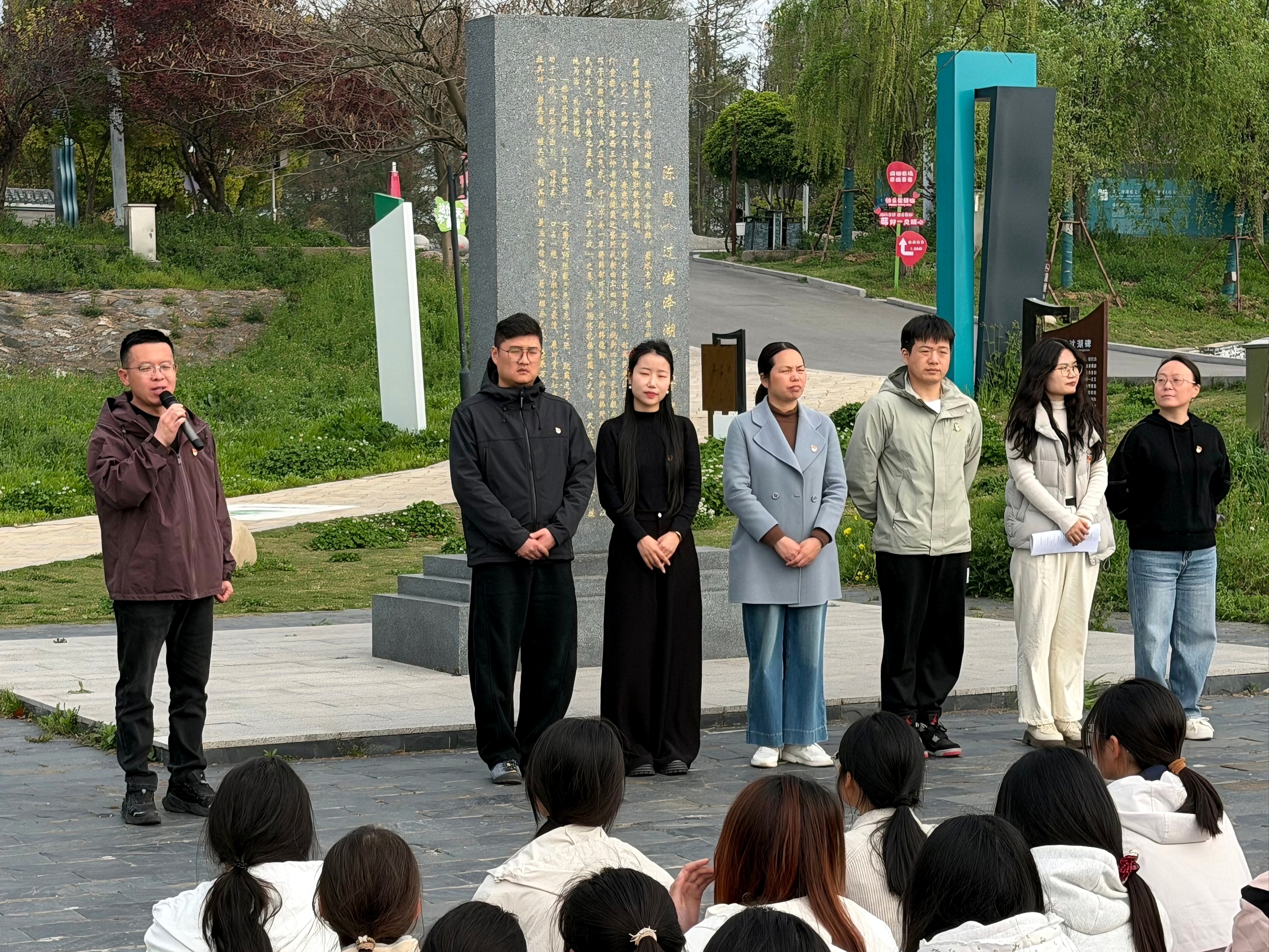 随后,全体师生前往周桥大塘遗址公园,在陈毅过湖碑前举行开班仪式。陈毅过湖碑见证了革命战争年代,新四军军长陈毅率部转战洪泽湖地区、三次渡湖开展革命斗争的峥嵘岁月,镌刻着革命先辈不畏艰险、坚守初心、为民奋斗的红色精神,是鲜活的红色教育教材。开班仪式由学生党支部书记杨鑫主持;支委委员杨钰雯详细介绍了本次业余党校党课核心学习内容、严明纪律要求与结业考核标准;学员代表王子琪结合当天的参观经历与自己的成长历程,分享了对党员先锋使命与责任担当的理解,表达了践行初心使命、争做时代先锋的坚定决心。